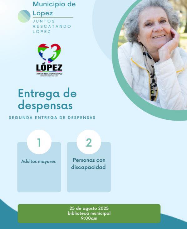 ¡Atención beneficiarios!Segunda entrega de despensas: Fecha: 25 de agosto Hora: 9:00 am Lugar: BibliotecaDirigido a: Personas con discapacidad Adultos mayores Requisitos: Organizan Presidencia Municipal de López Secretaría de Desarrollo Humano y Bien Común¡No faltes!